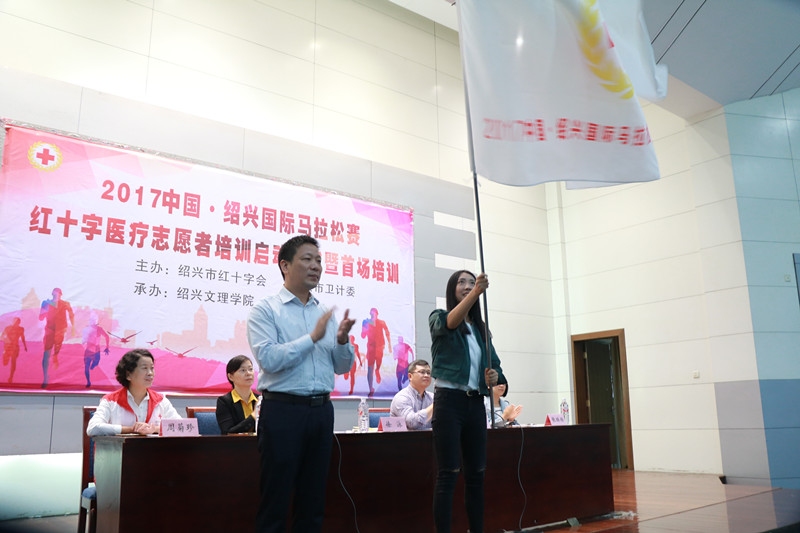 市红十字会副会长、执委会副主任徐泳为2017中国绍兴国际马拉松赛红十字医疗志愿队授旗并讲话。他指出,办好“越马”是展现绍兴人文的靓丽名片,也是展现绍兴内涵的智慧结晶,更是展现绍兴文明的集中体现。他提醒参加培训的志愿者们,要调整好心态,遵守纪律,多加练习,注重团队的协调和合作。