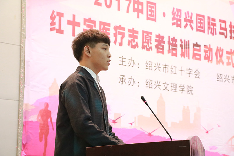 我院康复治疗学专业的蔡芳铭同学作为志愿者代表发言,他发出倡议:一是志愿者们要坚守自己的岗位,承担自己的责任,努力完成工作;二是志愿者们要怀抱着诚意,满怀信心来迎接挑战;三是要高质量奉献自己,只有掌握急救知识,牢记原则和方法,才能处理赛道上的紧急情况。