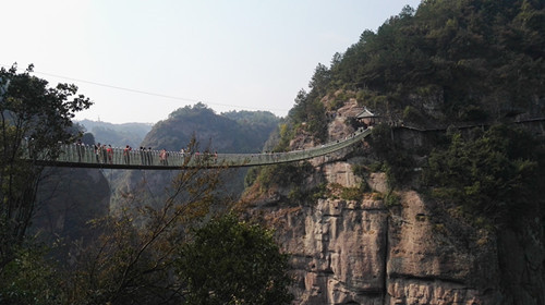 走进十九峰景区,给我们震撼的是十九连峰的气势,是藏于绝壁悬崖的神韵。特别是2016年绝壁上修建栈道后更是把大自然最美丽的风光呈现给世人,吸引了越来越多的游客。飞龙栈道由古木栈道、空中玻璃栈道和飞龙天桥三部分组成。百米玻璃栈道,3000米空中栈道和丹霞地貌完美结合,带给大家不一样的视觉体验。假日虽然人较多,但大家都有次序地拾级而上,互相提醒注意安全,漫步在百米的玻璃栈道之上,透过玻璃就能看到垂直的山体,仿佛置身于空中。极目远眺,高崖峭壁与丹山的红、竹子的绿、树叶的黄交错成一幅幅美丽的画面,无不让人赏心悦目,轻松获得唯美的观光享受。