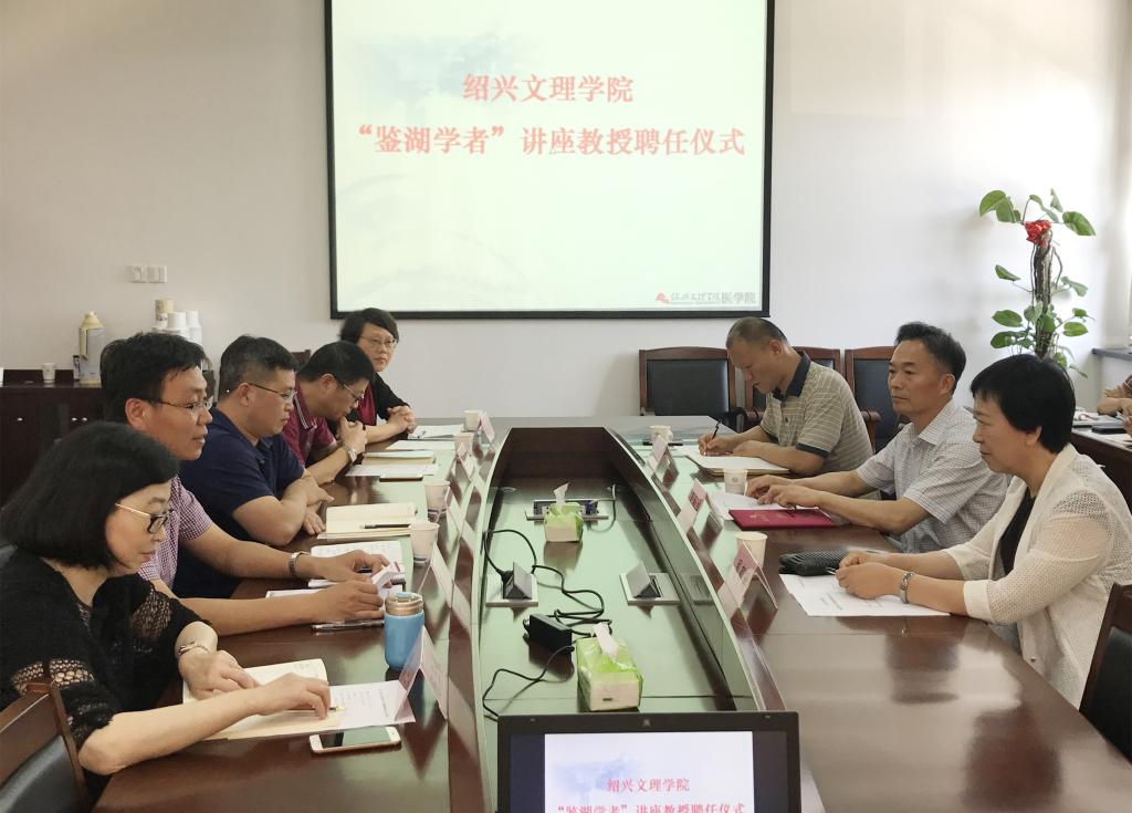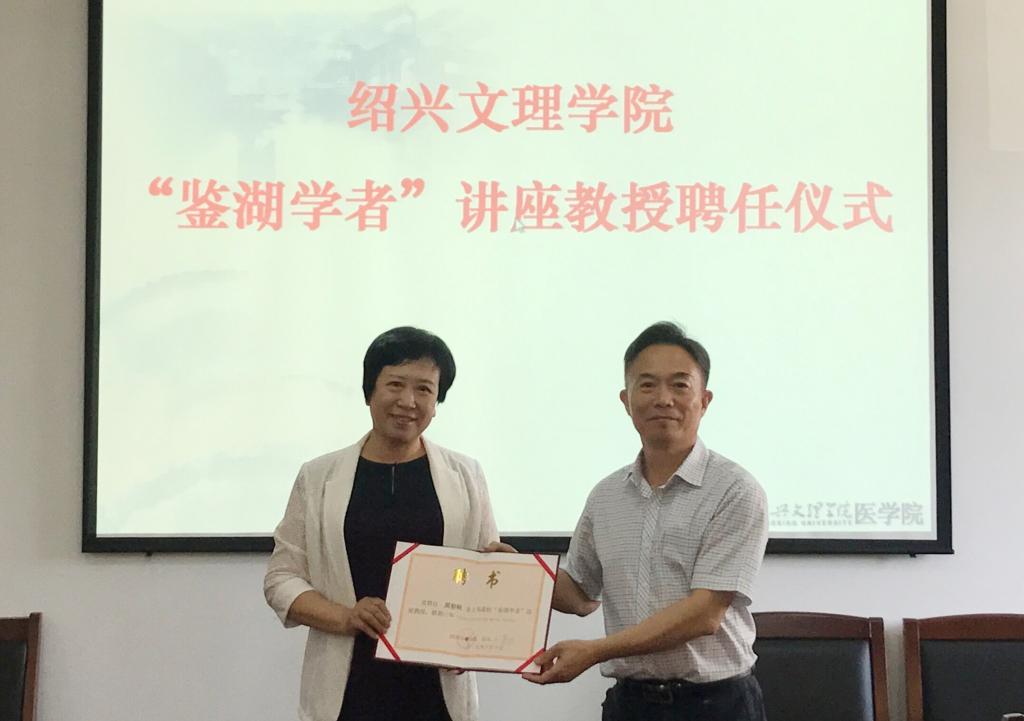 唐和祥副书记为周郁秋教授颁发绍兴文理学院“鉴湖学者”讲座教授聘书,并合影留念。