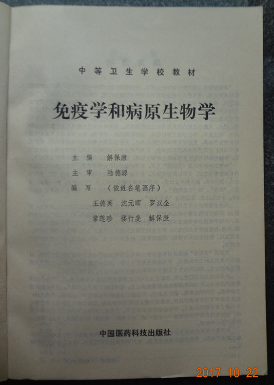 鉴于中等卫校课程设置有别于高等医药院校,我认为免疫学的进展现状和地位应该得到体现。在多次研讨会上,我坚持要把免疫学从微生物学中分离出来,另立篇章,并在书名上加以表达。为了不使书名过于冗长,我首创将微生物与寄生虫合称为“病原生物。”书名就称《免疫学与病原生物学》。我主编了以此为书名的“教学大纲”和教材。