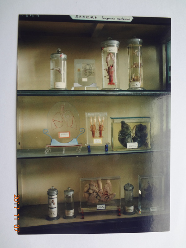 这些标本中,有绍兴常见的蚊子、苍蝇、跳蚤、虱子等的分布虫种,也有来自内蒙、新疆、东北稀有的虫种。大多是我自己采集,自己制作,也有与外地院校、高级科研单位交换得来。我校的寄生虫标本种类、分布比较齐全,是十分难得珍贵的。其中有些标本,可能现在已经非常罕见或绝迹成为“文物”了。举个例子,如绍兴兰亭的卫氏并殖吸虫(即肺吸虫)的成虫、囊蚴及成虫寄生的全肺标本,现在已非常罕见了。浙江有的医学高校、高级科研单位,曾来人来函从我手中要去,或交换去这些标本。
