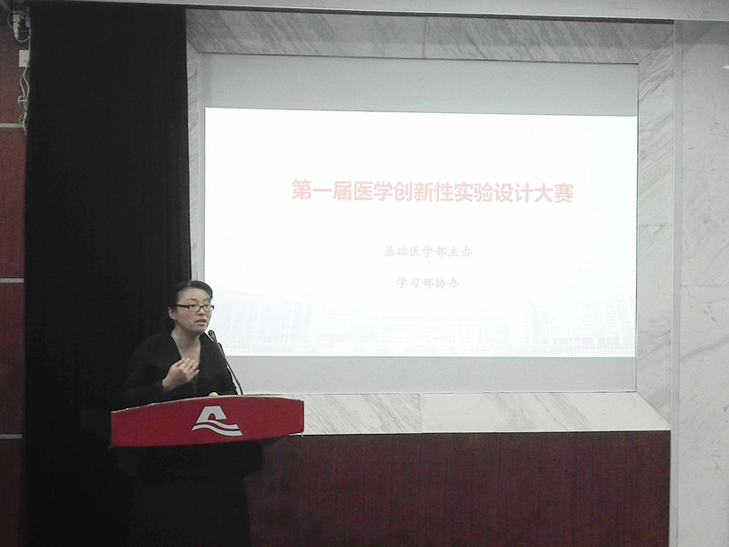 为了全面提高医学生实验设计能力,培养医学生的科学思维,激发医学生的创新潜能,提高医学生的综合素质,促进我院学生学术活动的蓬勃发展,基础医学部于10月14日在财贞楼二楼报告厅举办了首届医学创新性试验设计大赛。120多位同学报名参赛,陈佳玉、张衡、刘正、李海玉和冉娜老师担任本次大赛评委。