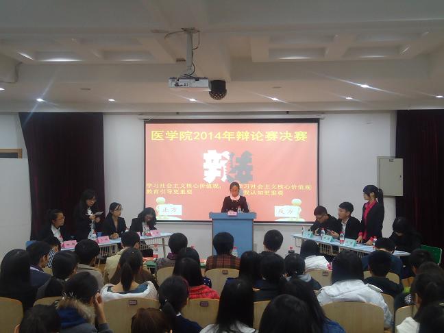 为提高我院学生思辩水平与临场应变能力,展现医学生严谨逻辑思维,由我院团委学生会主办、学习部承办的以“践行核心价值观,弘扬青春正能量”为主题辩论赛在11月26日下午于财贞楼一楼报告厅举行决赛。本次决赛由临床13级和元培护理1401两支代表队参赛,开云电子竞技官方网站专职组织员温多红老师,学生科副科长马国庆老师,开云电子竞技官方网站办公室副主任方志红老师、团委副书记顾玲玲老师,临床医学专业辅导员席德科老师受邀担任此次辩论赛的评委。