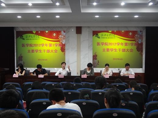 为传达学院中层干部会议和教职工大会会议精神,部署新学期学生相关工作,9月19日中午12:30,我院在财贞楼二楼学术报告厅举行了2012学年第二学期主要学生干部会议。学生科副科长马国庆、辅导员丁正邦、顾玲玲、席德科、胡晓琳出席会议。团委、学生会部长级以上学生干部,辅导员助理,党员督察队成员,各班班长、团支书、副班长、学习委员和2012级新生班级临时负责人近170人参加科会议。会议由团委书记赵华主持。