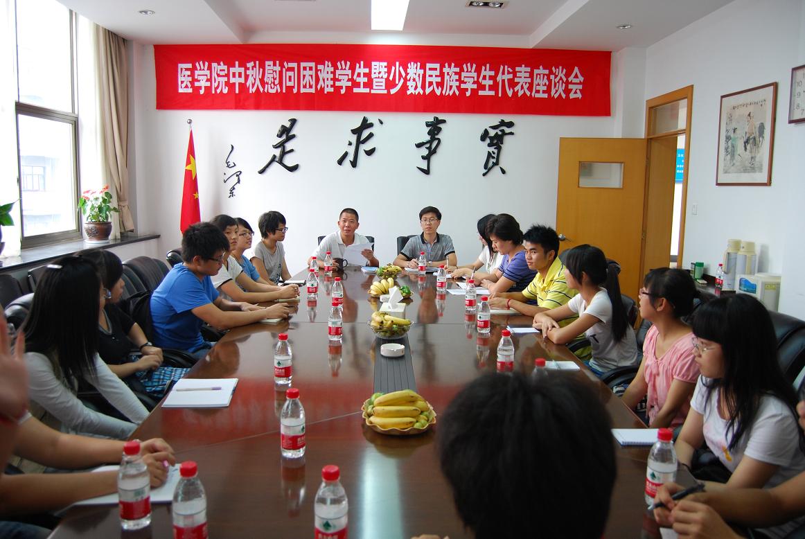 八月仲秋,丹桂飘香,在传统中秋和国庆双节来临之际,为了让远离家乡的同学们感受到节日的温馨,9月28日下午,我院在行政楼319会议室举行了中秋慰问困难学生暨少数民族学生代表座谈会。院党委副书记吴剑平、学生科副科长马国庆、团委书记赵华与及学生代表20余人参加座谈。座谈会由资困助学辅导员胡晓琳主持。