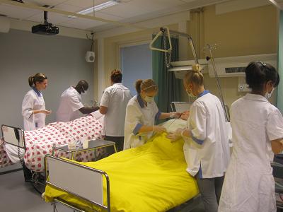 操作:学生操作分组往往是随机分组的,教师分组授课,一位教师负责一个小组,每组学生大概4-8人。演示和练习往往同时呈现、病人和医护工作者往往互相模拟,操作在不违背基本原则的前提下没有非常固定的模式。许多操作是小组合作一起完成的,特别是CPR演练。我要特别提一下学生穿的白大褂,因为学校不收额外的费用,因此没有统一配发的白大褂,学生可用各种途径购买、借用,因此在操作课时你能看到不同样式的白大褂。