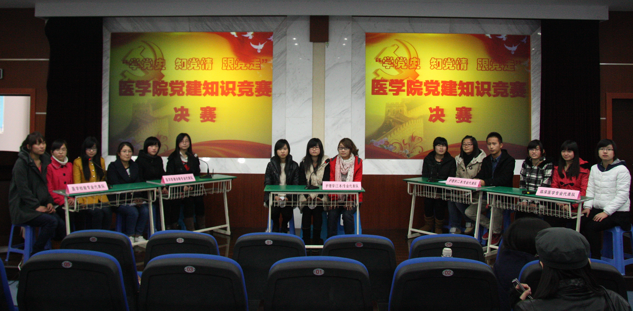 本次党建知识竞赛经过激烈的初赛角逐,各专业初赛成绩最高的三位同学分别组成临床医学专业、医学影像诊断专业、医学检验专业、护理学(二本)专业、护理学(三本)专业5支代表队进入决赛。