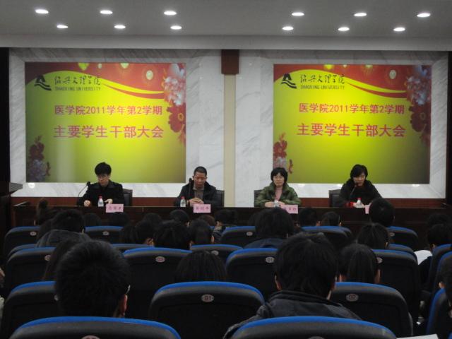 3月14日下午,学院在财贞楼二楼学术报告厅举行2011学年第2学期主要学生干部大会。院党委副书记吴剑平、院党委专职组织员温多红、学生科副科长马国庆和院团委、学生会、社团负责人、辅导员助理、党员督察队成员及各班班长、支书、副班长近200人参加了会议。会议由团委书记赵华主持。