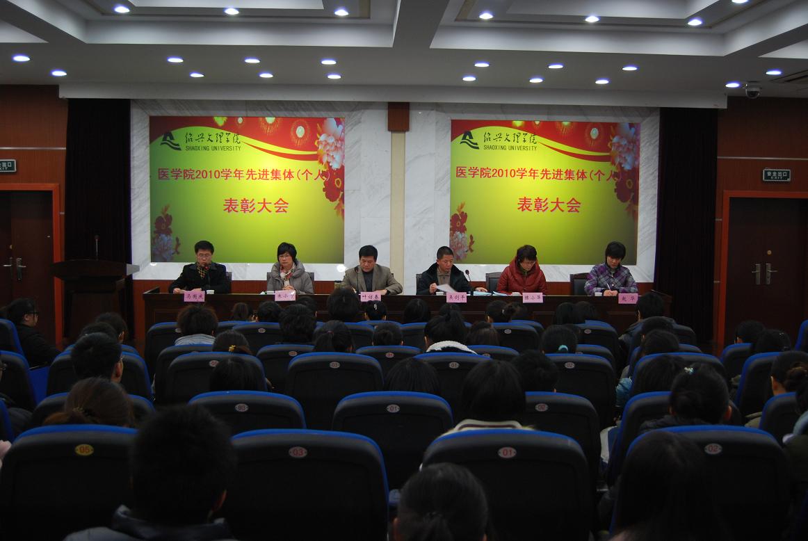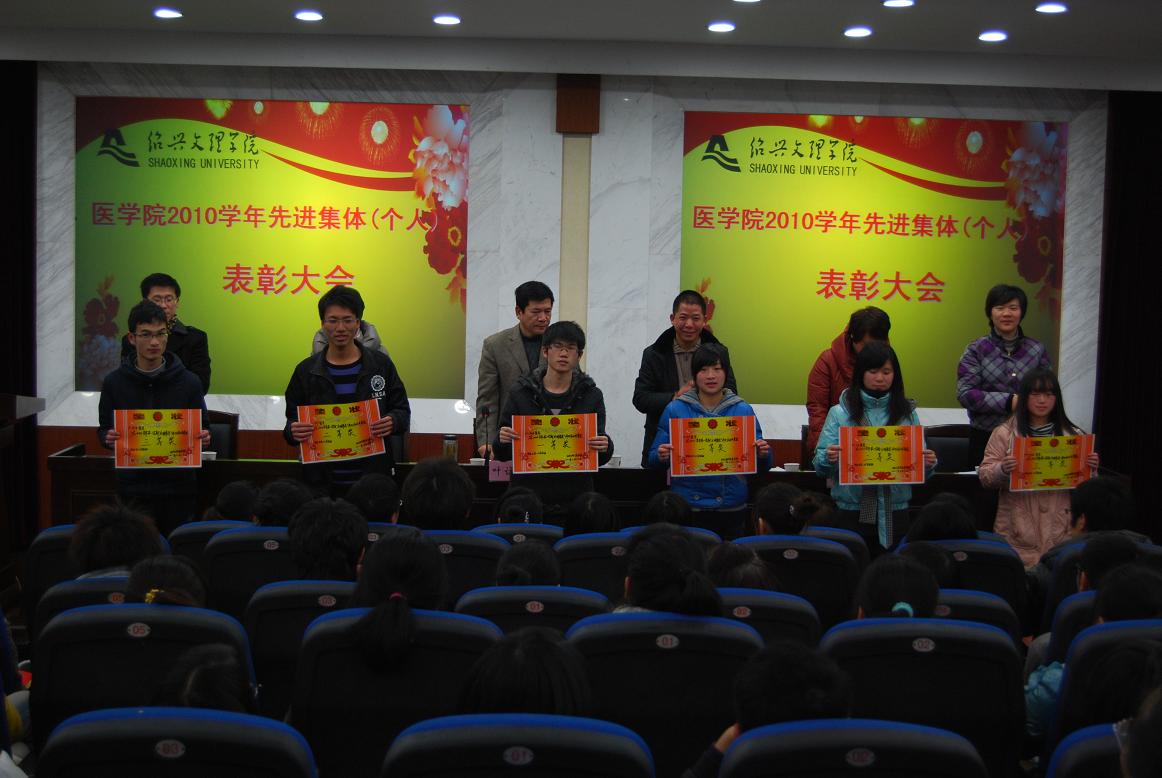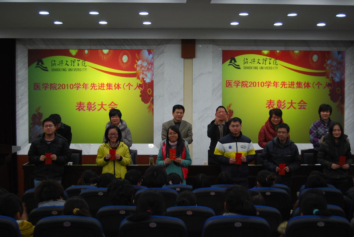 与会人员全体起立,铿锵的义勇军进行曲回响在整个会场,拉开了表彰大会隆重而热烈的序幕。吴剑平副书记宣读《绍兴文理学院开云电子竞技官方网站关于表彰2010学年学生先进集体、先进个人的决定》、朱小芳副院长宣读《大学英语四级考试前三名、六级一次性通过者名单》和教研科负责人宣读《关于表彰2011学年第1学期“文明寝室”、“优秀寝室长”的通知》后,先进班集体、优秀学风班代表、奖学金获得者代表、四六级受奖励者代表、文明寝室优秀寝室长代表分组上台领奖。先进班集体代表护理学103班班长陈筱、先进个人代表、一等奖学金获得者、院学生会主席王诗韵在发言中与大家分享了自己班级在专业学习、素质培养、课题研究、各级各类大赛活动中加强班风学风建设的经验和成果。她们表示,绝不会止步于现有的成绩,今后将继续团结奋进,互帮互助,共同进步。