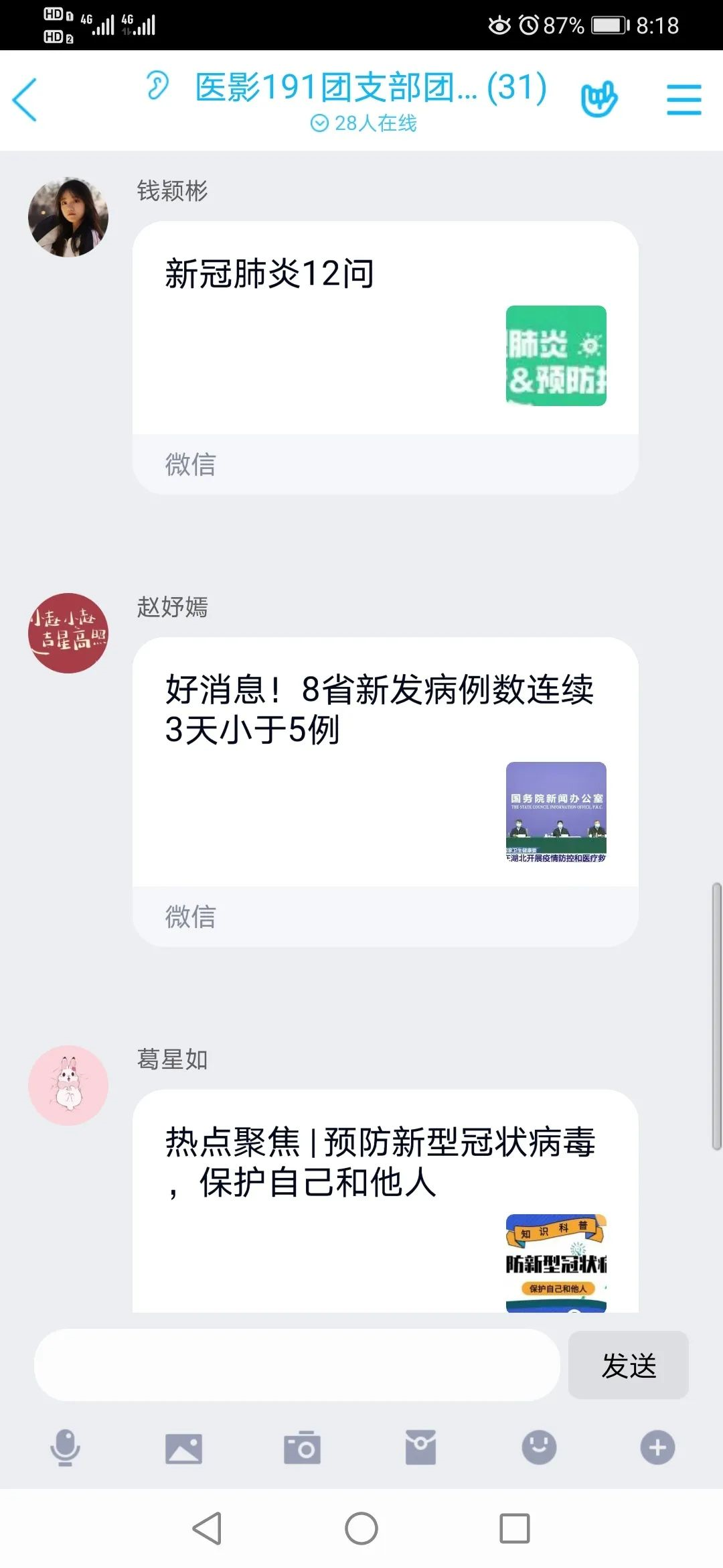 每一位团员都争取先锋岗,协助所在学院团委履行好职责使命,做好了表率。在各类线上活动中亮明身份,协助所在学院团委履行好职责使命,做好了表率。在疫情结束前,经常性在团支部内发布权威信息、宣传防控措施、有效疏导恐慌情绪、传播健康卫生知识、坚决遏制谣言扩散,狠抓学校各项防控措施在团支部的落地落实,科学有序参与疫情防控工作,带头高质量地落实了组织交付的各项任务。