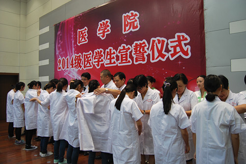 绍兴市妇幼保健院院长何炳福,绍兴市中医院院长张居适,绍兴市第七人民医院院长楼正龙,开云电子竞技官方网站副院长、校附属第二医院、绍兴第二医院院长葛孟华,开云电子竞技官方网站副院长、校附属第一医院、绍兴市人民医院副院长钱宇、开云电子竞技官方网站副调研员夏国园,校附属医院党委副书记、开云电子竞技官方网站医学影像系主任夏瑞明,临床医学部主任黄丹文,护理系主任陈三妹,医学检验系主任刘丽华等十位医学前辈为2014级医学生代表穿上了象征着衣钵相承、薪火相传的白大褂。在领誓人夏瑞明教授的带领下,全体2014级新生将右手放在左胸前庄严宣誓,决心为祖国医药卫生事业和人类身心健康奋斗终身。