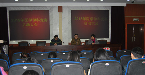 1月13日下午,我院2015年医学学科竞赛工作启动大会在财贞楼学术报告厅举行。院党委副书记袁油迪、副院长葛建荣出席大会,临床医学部、医学实验中心负责人及班主任、部分教师、临床10级报名选拔学生等参加了启动大会。大会由袁油迪副书记主持。