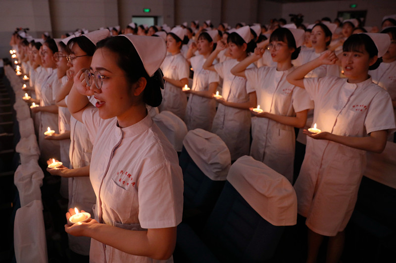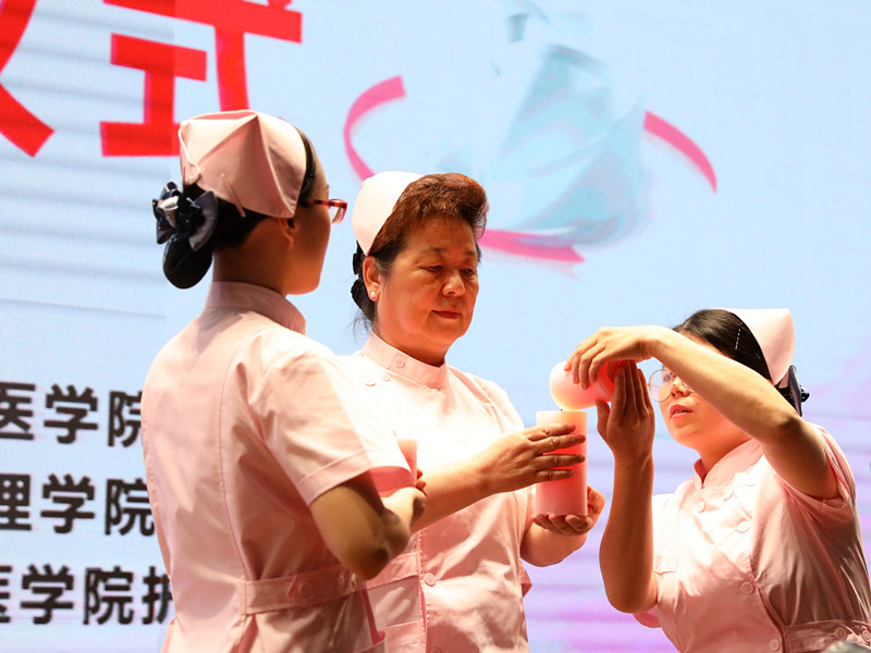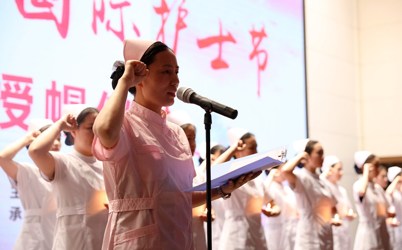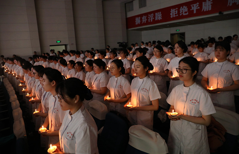 在护理学临床教师、优秀校友代表丁红英老师的领誓下,188位护生举起右手,庄严宣誓:我志愿献身护理事业,奉行革命的人道主义精神,坚守救死扶伤的信念,履行“保存生命、减轻痛苦、促进健康”的职责。我宣誓:遵守护士的职业道德规范,像南丁格尔那样,以一颗同情心和一双愿意工作的手,以真心、爱心和责任心对待每一位病人。我宣誓:不忘今天的决心和誓言,热爱专业,勤勉好学,忠于职守,兢兢业业,接过前辈手中的红烛,将毕生精力奉献给护理事业。