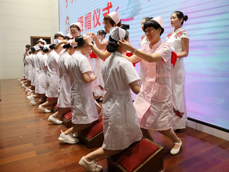 188位护生手捧蜡烛,10人一组,依次缓步走上主席台,虔诚直跪,马红丽、王芳、张园芳、马乐娟、陈金芳、郭伟利、俞莉、陈三妹、周瑾、陈小萍等10位护理前辈们为他们戴上圣洁的燕尾帽。