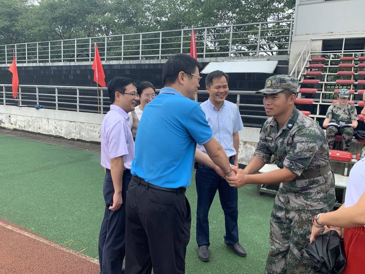 在现场,夏瑞明书记与教官亲切交流,了解了我院2019级新生军训训练的实时情况,并表达了对他们认真负责工作的感谢。看到新生们迈出的整齐步伐,展现出了昂扬向上的精神风貌,夏书记充分肯定了这几天训练的成果,殷切鼓励军训新生们要向教官学习,努力培养吃苦耐劳的精神、坚毅勇敢的品质。葛副院长、金副书记则叮嘱同学们要注意天气变化,不要忘记吃早餐,注意自身的身体状况,同时提醒指导员们要切实关心同学情况,做到有效引导与督促。