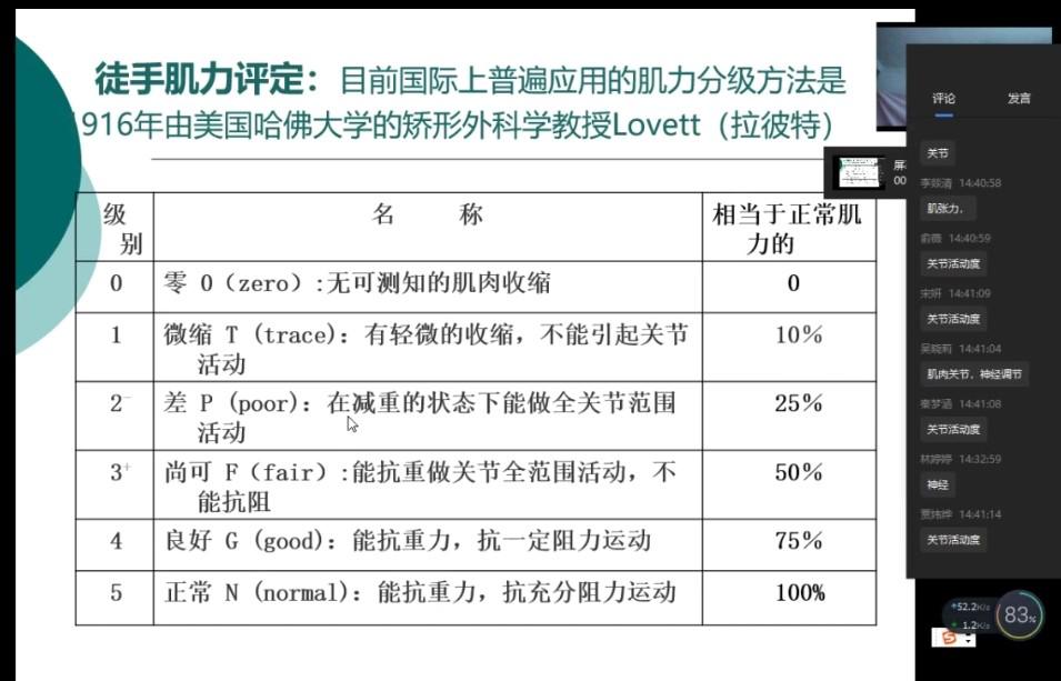 (2)课中学习:通过学生学习进度与课前自测的综合分析,先做一个简要的小结,并初步掌握学生可能存在的疑难点,在课程精讲中进行深化。(如在测试中学生所反映出来的肌力等级判定问题,有65%的同学分析错误是由于在抗重与抗阻力的前提方面分析不清晰,因此在课程中进行了精讲、细讲)。借助连麦及评论区互动的方式,逐层分解评定等级中的差异及讨论测量中可能存在的问题及注意事项,并通过课中提问及测试的形式,评估学生学习的效果,并进行疑难问题的解答。