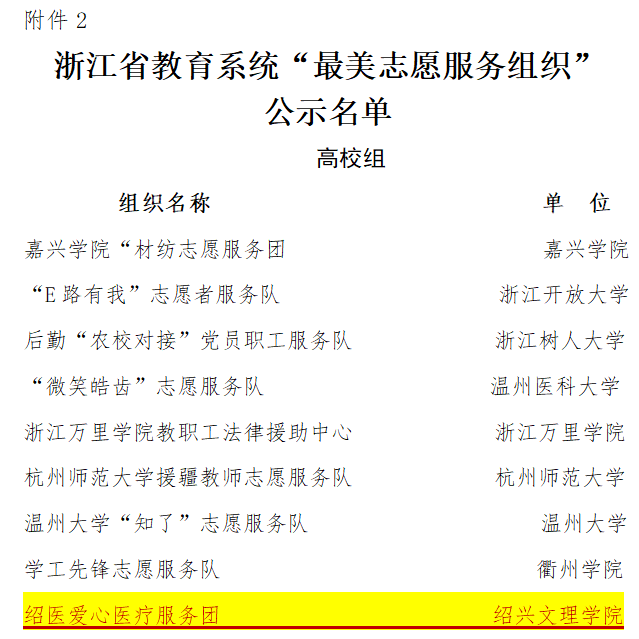 日,我院“绍医爱心医疗服务团”获得浙江省教育系统“最美志愿服务组织”称号。