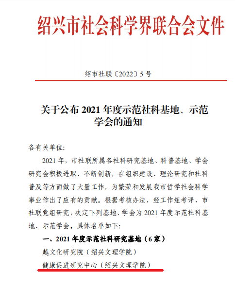 日前,经过绍兴市社科联的严格评审,开云电子竞技官方网站健康促进研究中心获批为绍兴市2021 年度示范社科基地。