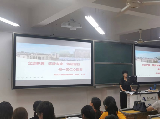 最后校附属第二医院护理部王芳主任为学生做了“立志护理,筑梦未来,笃定前行”的主题报告。她从医院的发展角度出发,介绍了校附属第二医院的发展历史,和同学们分享了自己对护理的体会,从护理工作感悟,护理工作体会,护理专业发展现状,护理职业生涯管理等四个方面详细阐述了自身发展历程,怎样在不断地斗争中征服困难,怎样在日常病例拥有辩证思维,并和学生分享了自身的科研经历,勉励学生不断提升自身,在未来走出更广阔的的天空。随后其结合当下护理发展背景,强调当前护士资源短缺的现状,加强专科护理的发展趋势,提出学生要在职业道路上走的坚定,有强烈的奉献精神。最后就护士的职业生涯规划提出了5个W的疑问,提出在护士职业发展的过程中应综合发展自己,引发学生的不断思考。并勉励学生们立志护理,筑梦未来,笃定前行!