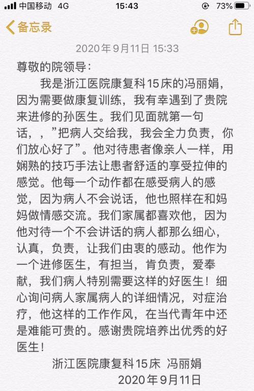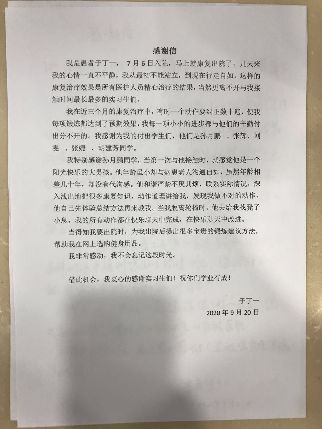 在实习期间,以孙月鹏同学为代表的我系同学,用优良的作风、娴熟的技术,温暖和服务每一位康复病患,展现了绍医学人应有的深厚学养与仁爱之心。