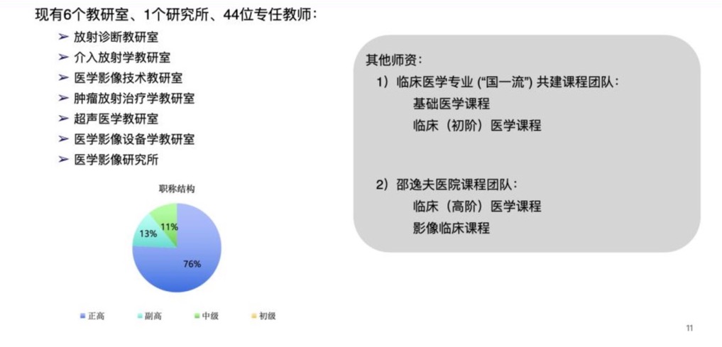 医学影像学专任教师根据课程模块分为三组。医学影像学模块现有6个教研室1个校级医学研究所,专任教师44名,其中正高职称教师占比76%、副高职称教师占比13%、中级职称教师占比11%;开云电子竞技官方网站内教师(基础医学课程和初阶临床课程模块)教师23名,其中正高职称教师占比35%、副高职称教师占比17%、中级职称占比48%;浙江大学开云电子竞技官方网站附属邵逸夫医院课程团队专任教师99人(不含临床见习带教老师),正高职称教师占比34%、副高职称教师占比57%、中级职称教师占比9%。临床主干课程的授课教师多数来自临床一线的“双师型”教师。