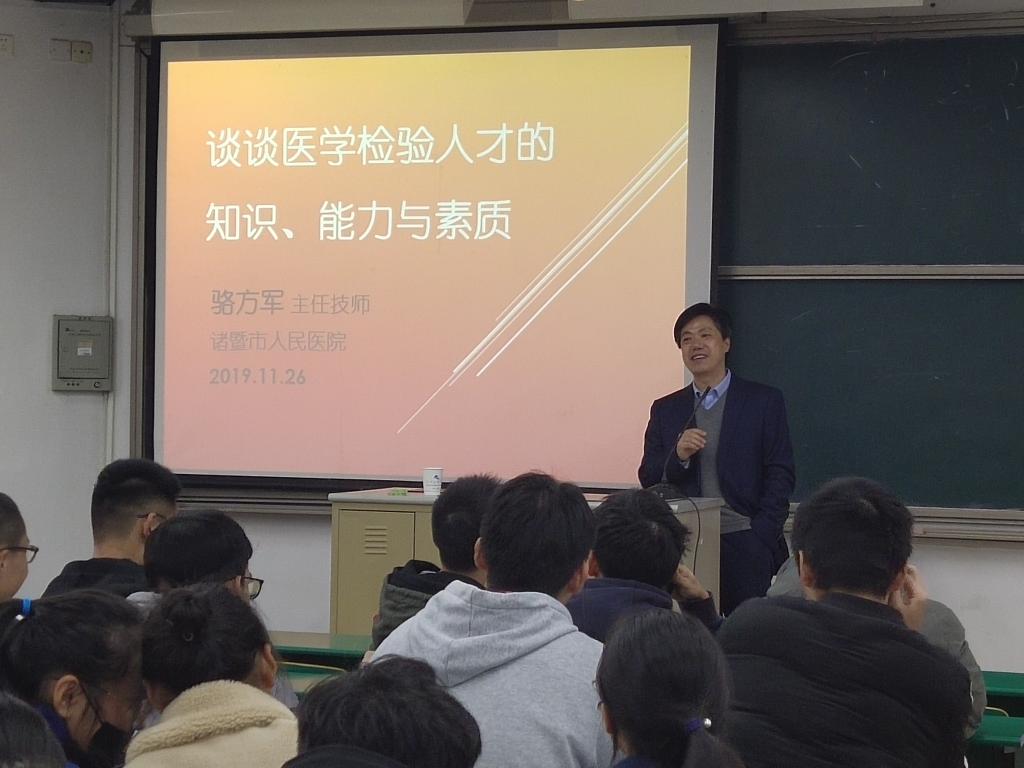 11月26日下午,诸暨市人民医院检验科骆方军主任受邀来我系作专题报告,题目是《谈谈医学检验人才的知识、能力与素质》。这次活动是医学检验技术专业导论课程的一部分,也是2019级新生始业教育的一个重要环节,医检191班、181班全体学生以及部分教师参与本次活动。