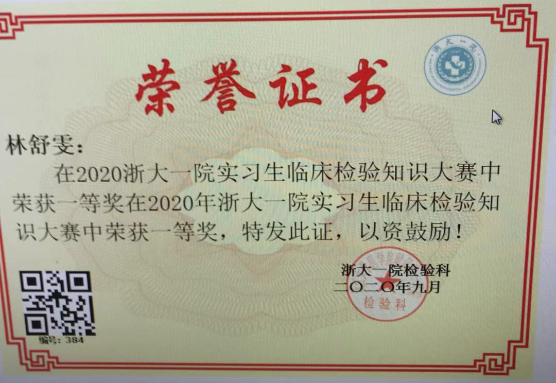 浙大一院为积极响应2020年浙江省临床检验技能竞赛,并强化实习生队伍建设,检验科成员认真筹备此项大赛相关工作;本次大赛按照考试成绩对所有参赛实习生进行排名,其中设置一等奖3名、二等奖6名、三等奖10名。我系同学在所有实习生中,成绩位列前茅,包揽一等奖名额。