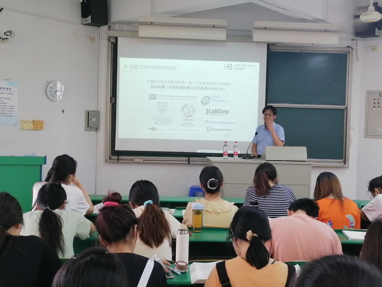 孔宏伟博士介绍了质谱发展简史、质谱应用领域、质谱临床检测的优势、质谱的基本概念与定义、质谱的分类、质谱的谱图、质谱系统的结构以及几个重要参数。孔博士称质谱技术凭借其准确性和高通量等特点,非常适合在生化分析、微生物鉴定、病理研究、科研诸多方面发挥特长。在座的老师和同学们纷纷表示受益匪浅。