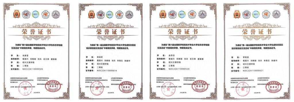 7月12-13日,由高等学校国家级实验教学示范中心联席会、全国高等医学教育医学检验专业校际协作会、全国高等学校医学检验专业联盟、南方医科大学、山东第一医科大学主办的第六届全国医学检验技术专业大学生形态学技能交流活动和第一届全国医学检验技术专业大学生虚拟仿真实验诊断技能交流活动在山东第一医科大学如期举行。受疫情影响,本次大赛采用线上比赛的方式进行,来自全国49所本科院校和13所专科院校的同学们在线上进行了交流切磋。经过初赛和决赛的激烈角逐,我系医学检验技术191班学生朱家莹、陈佳欢荣获本科组二等奖,金苏洁、茅凯丽荣获本科组三等奖。