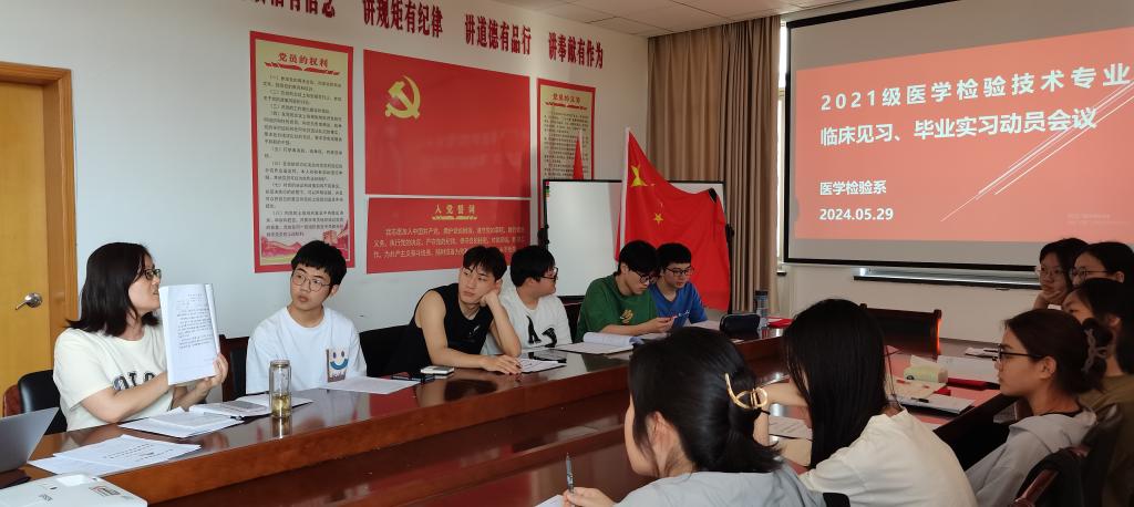 2024年5月29日下午我系召开2021级医学检验技术专业临床见习、毕业实习动员大会,会议由系副主任刘晓瑜老师主持、开云电子竞技官方网站医教协同管理办公室主任陈魏燕、绍兴市人民医院检验科主任张丽红应邀参会及我系部分教师参加。