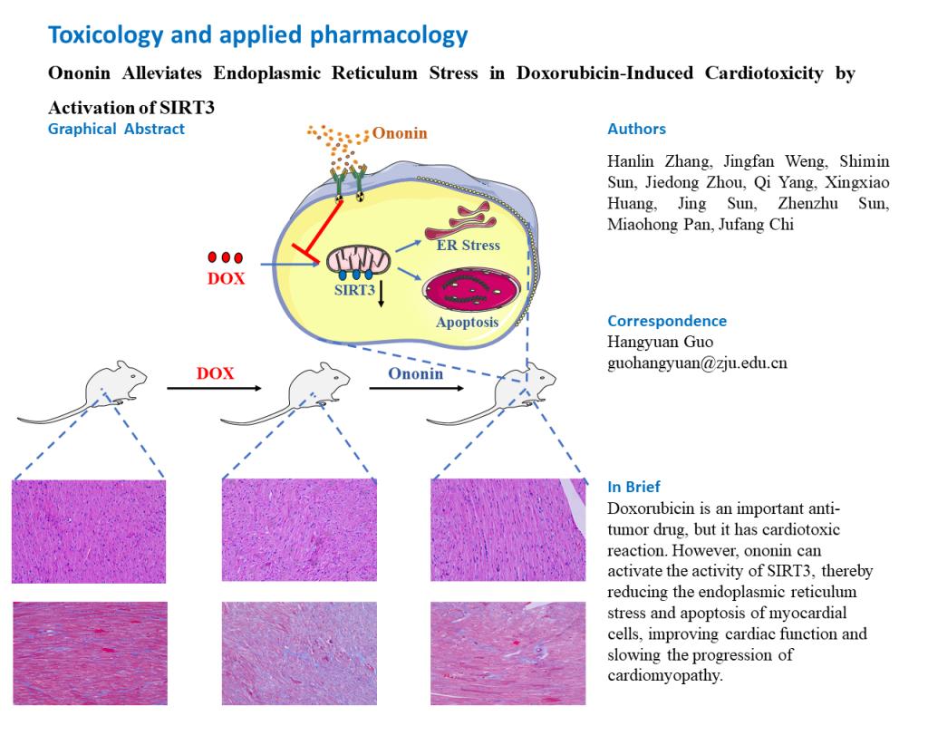 近日,郭航远教授指导临床医学硕士研究生在国际著名药物毒理学杂志Toxicology and Applied Pharmacology 在线发表《Ononin alleviates endoplasmic reticulum stress in doxorubicininduced cardiotoxicity by activating SIRT3》文章,该文阐明Ononin在DOX诱导的心脏毒性中可能的心脏保护作用和潜在的分子机制。Ononin的心脏保护作用由SIRT3的激活和随后抑制ER应激介导。这些发现表明,靶向SIRT3的药物可能在减轻DOX诱导的心脏毒性方面具有治疗潜力。温州医科大学研究生张含林同学,温州医科大学研究生孙世民同学和浙江大学研究生翁惊凡同学为共同第一作者,研究生周杰栋,黄兴晓,杨琦,孙静以及绍兴文理学院潘妙虹共同参与,郭航远教授为通讯作者。